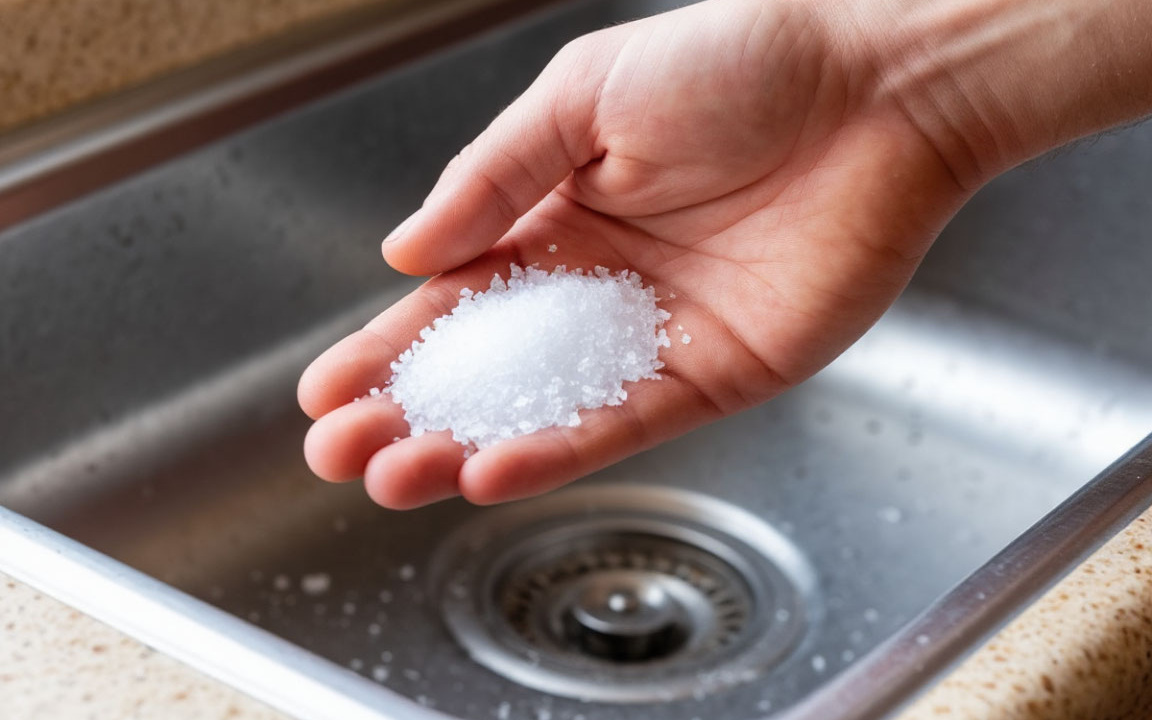 - Nasypte do odtoku 5–7 lžic soli. Hodí se jak jemná, tak hrubá sůl.