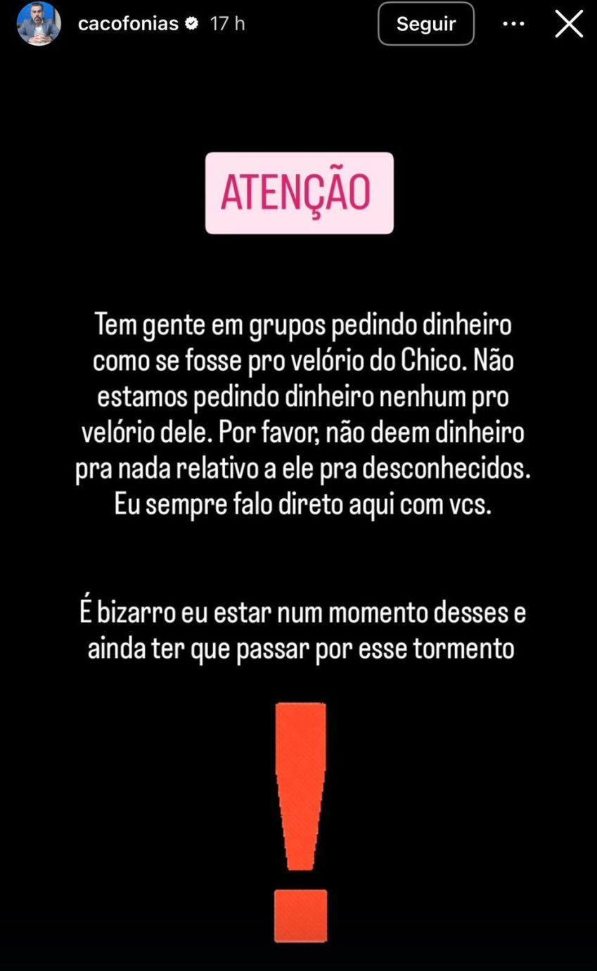 Komik Vinicius Antunes oznámil, že podvodníci využívají smrt jeho syna Francisca Fariase Antunese ve věku 10 let, aby se pokusili získat peníze podvodně. podle něj lidé bude žádat o dary ve skupináchtvrdí, že částky budou použity na zaplacení probuzení dítěte.