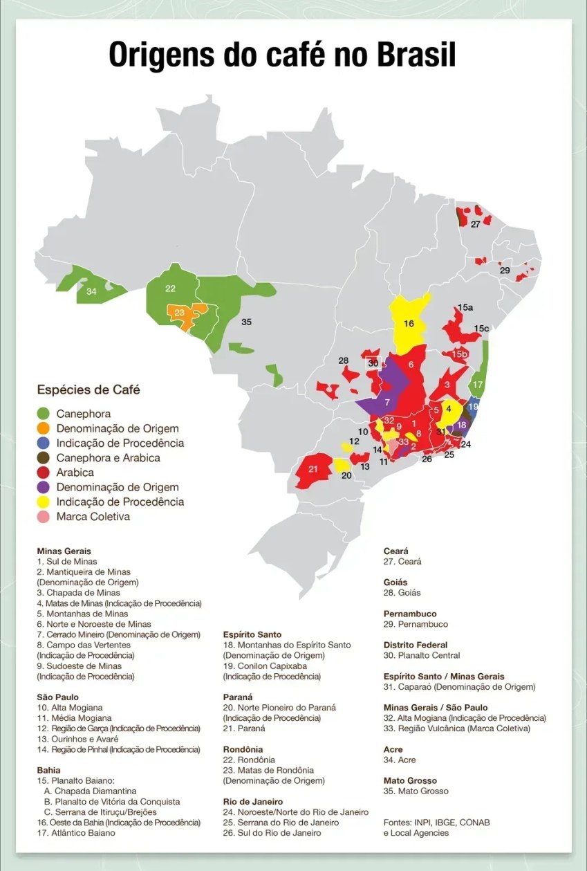 V současné době má Brazílie 14 zeměpisných označení, která uznává Národní ústav průmyslového vlastnictví (INPI), což podle Ministerstva zemědělství a živočišné výroby (MAPA) posiluje oceňování specifického původu a vlastností.