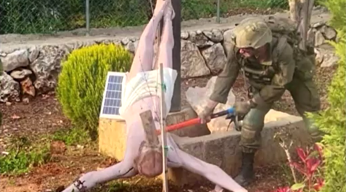 Snímek, který byl zveřejněn na sociálních sítích v neděli (19), ukazuje izraelského vojáka, jak udeří sekerou do padlé sochy Ježíše.